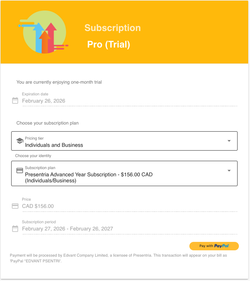 2. Scroll down to the Subscription section. Select the paid service and pay with credit cards or credits using PayPal. You do not need to have a PayPal account. All major credit cards are accepted.